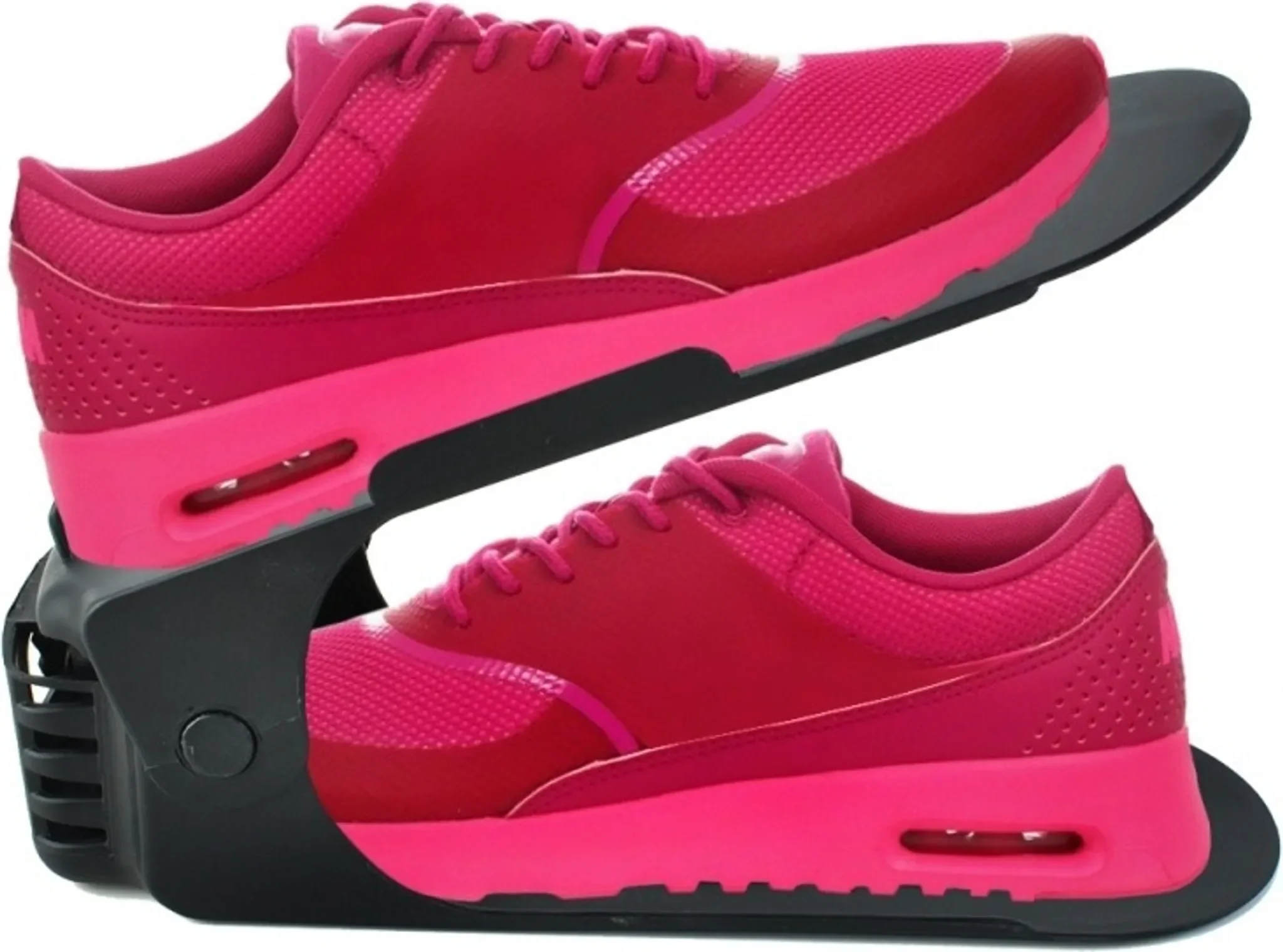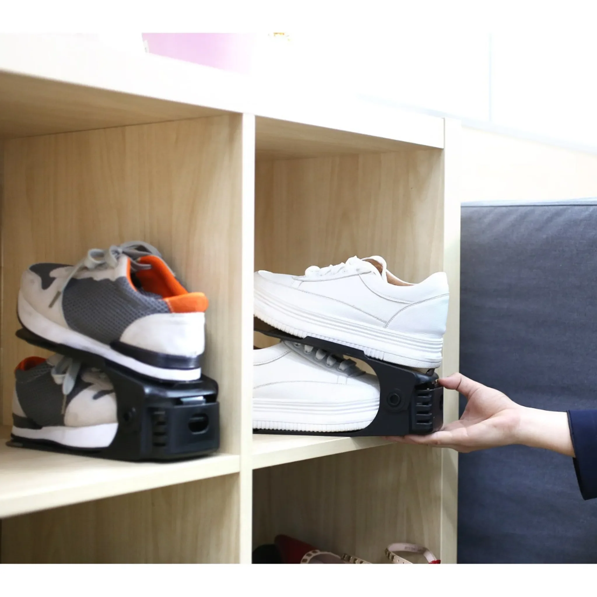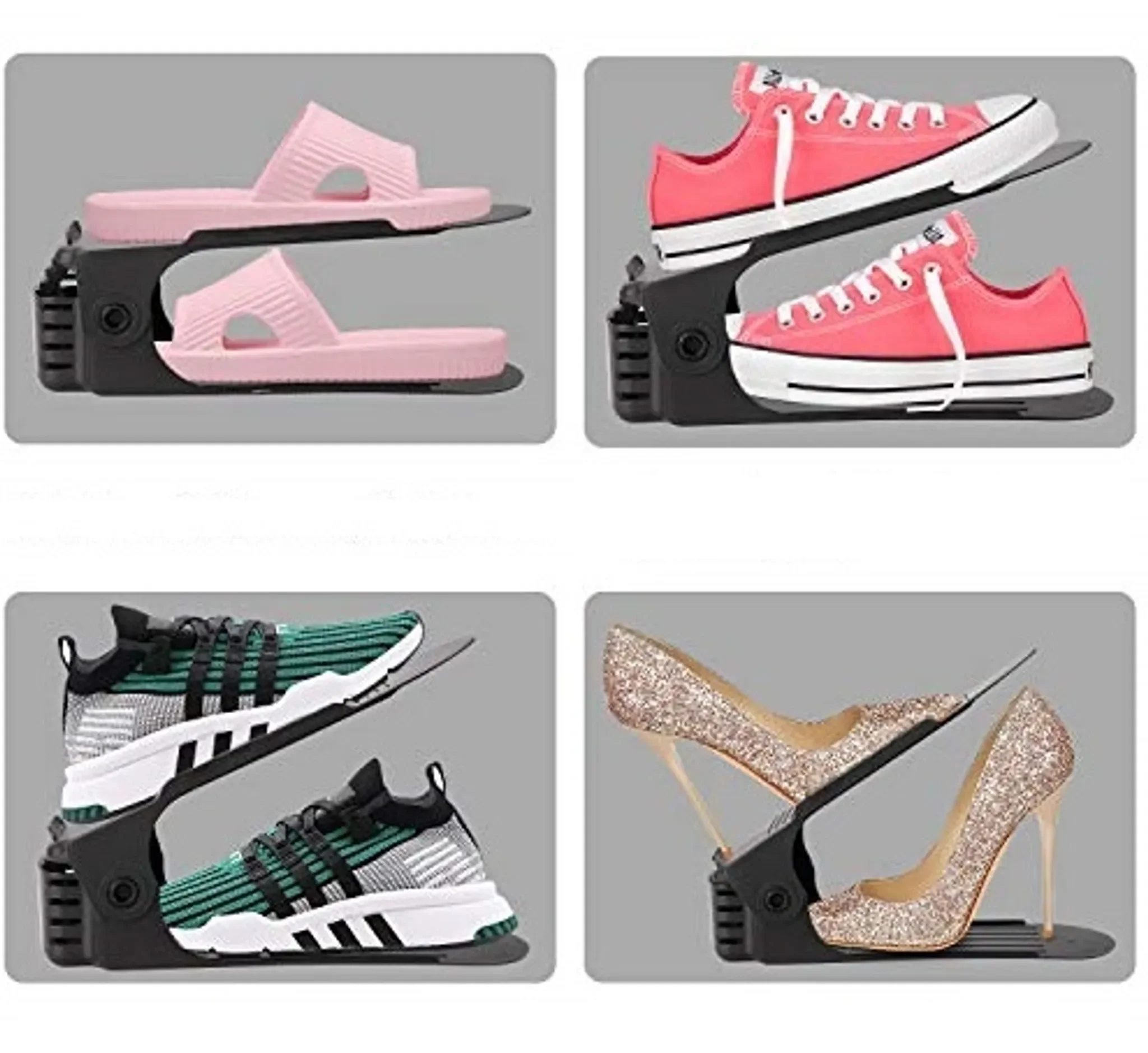 Die rutschhemmende Oberfläche und die leicht erhöhten Seiten verhindern ein Verrutschen. Ideal für Haushalte mit wenig Stauraum oder große Schuhsammlungen. Die Höhe lässt sich passend zum jeweiligen Schuhmodell einstellen.