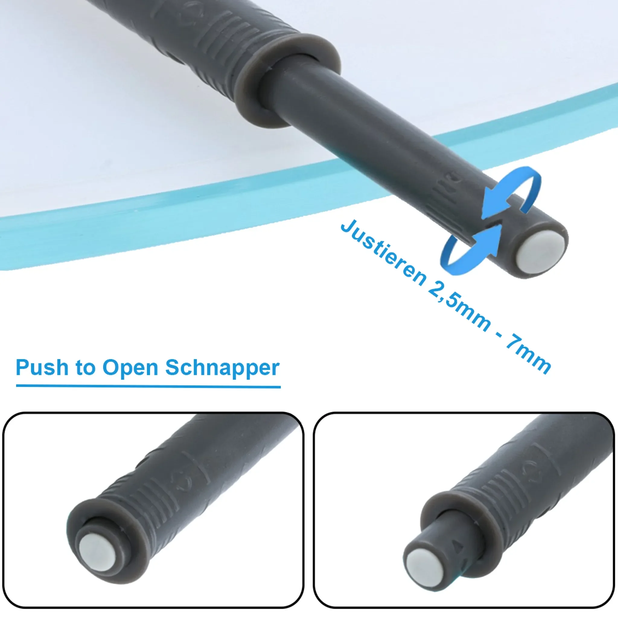 Die Gummispitze reduziert Geräusche und sorgt für ein sanftes Schließen der Tür. Die Integration erfolgt mit Aufschraubadapter im Möbelkorpus und eignet sich ideal für Küchenfronten, Wohnmöbel und Schranktüren.