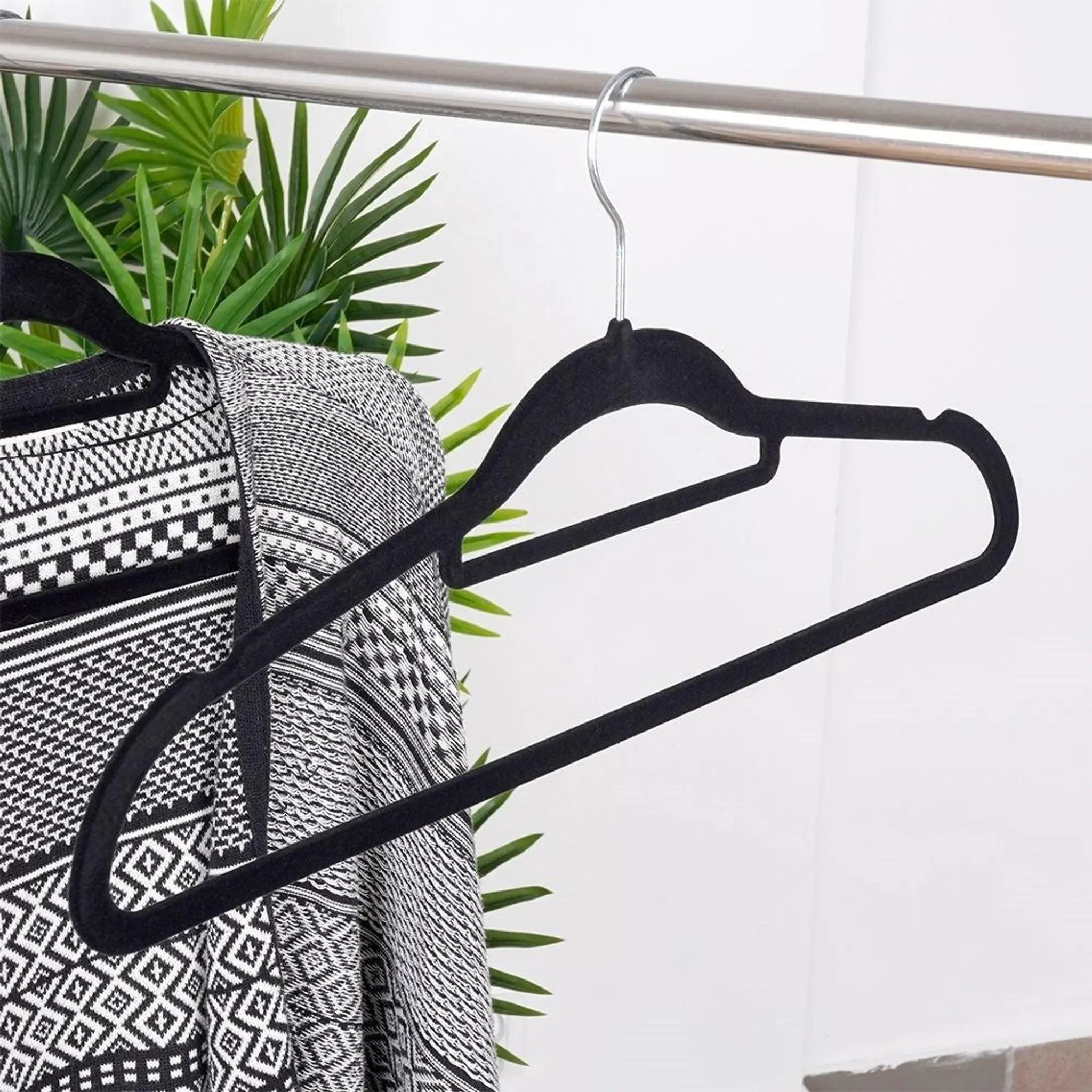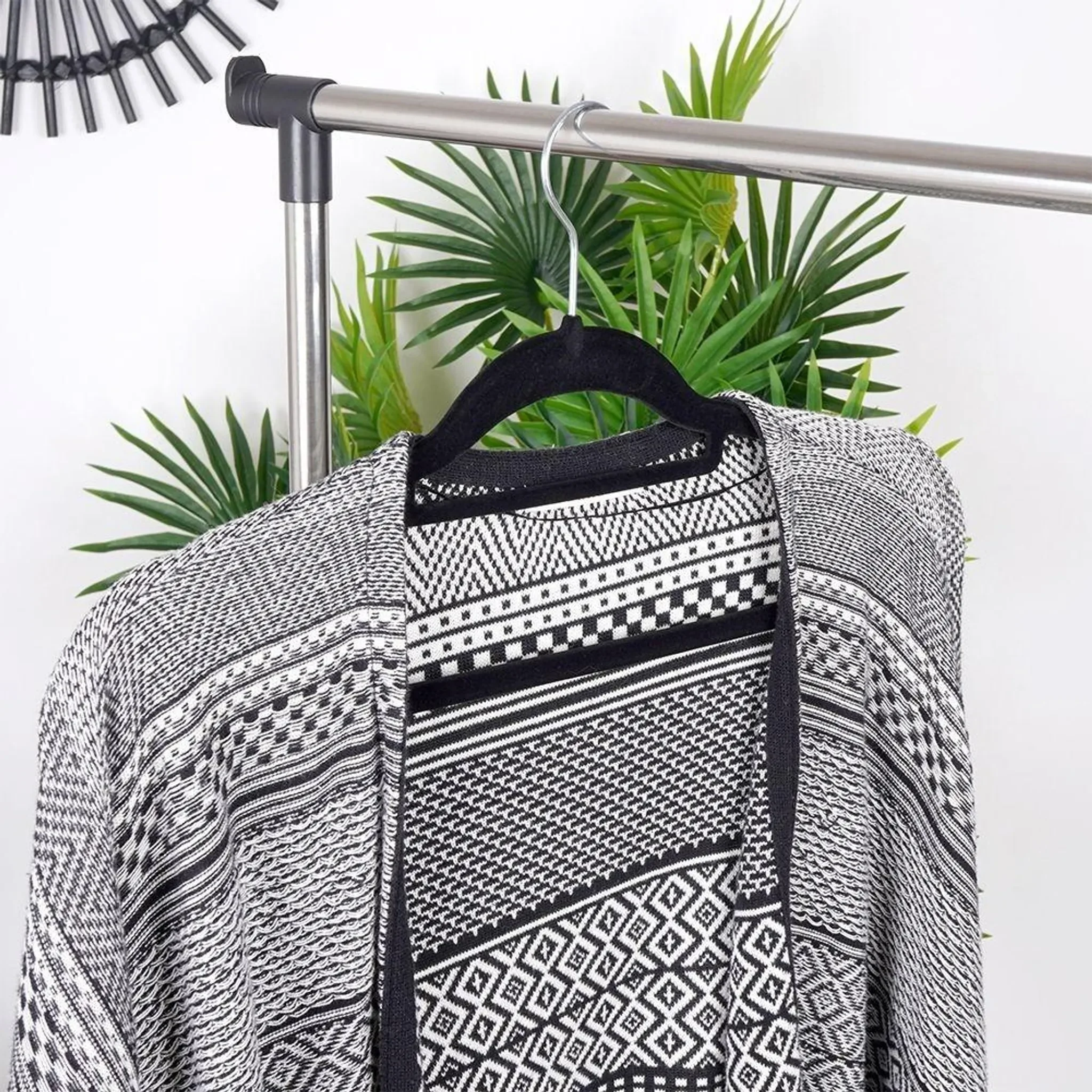 Dieses Set aus 10 drehbaren Kleiderbügeln bietet eine elegante und zugleich praktische Lösung für die tägliche Kleideraufbewahrung. Die Bügel bestehen aus robusten Materialien und sind vollständig mit weichem, schwarzem Samt überzogen – ideal, um Kleidung rutschfest, knitterfrei und schonend aufzuhängen.