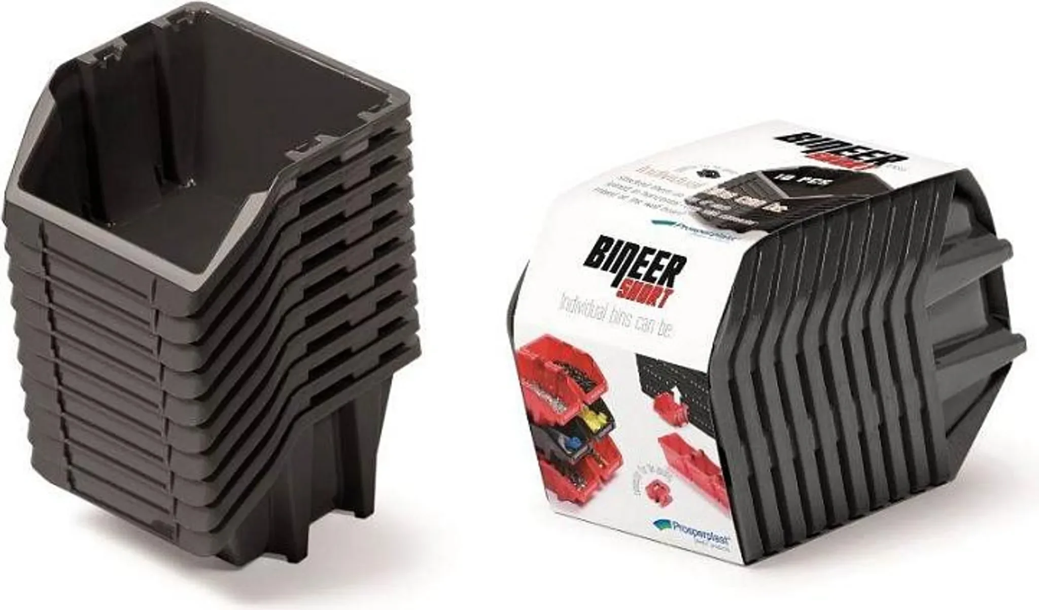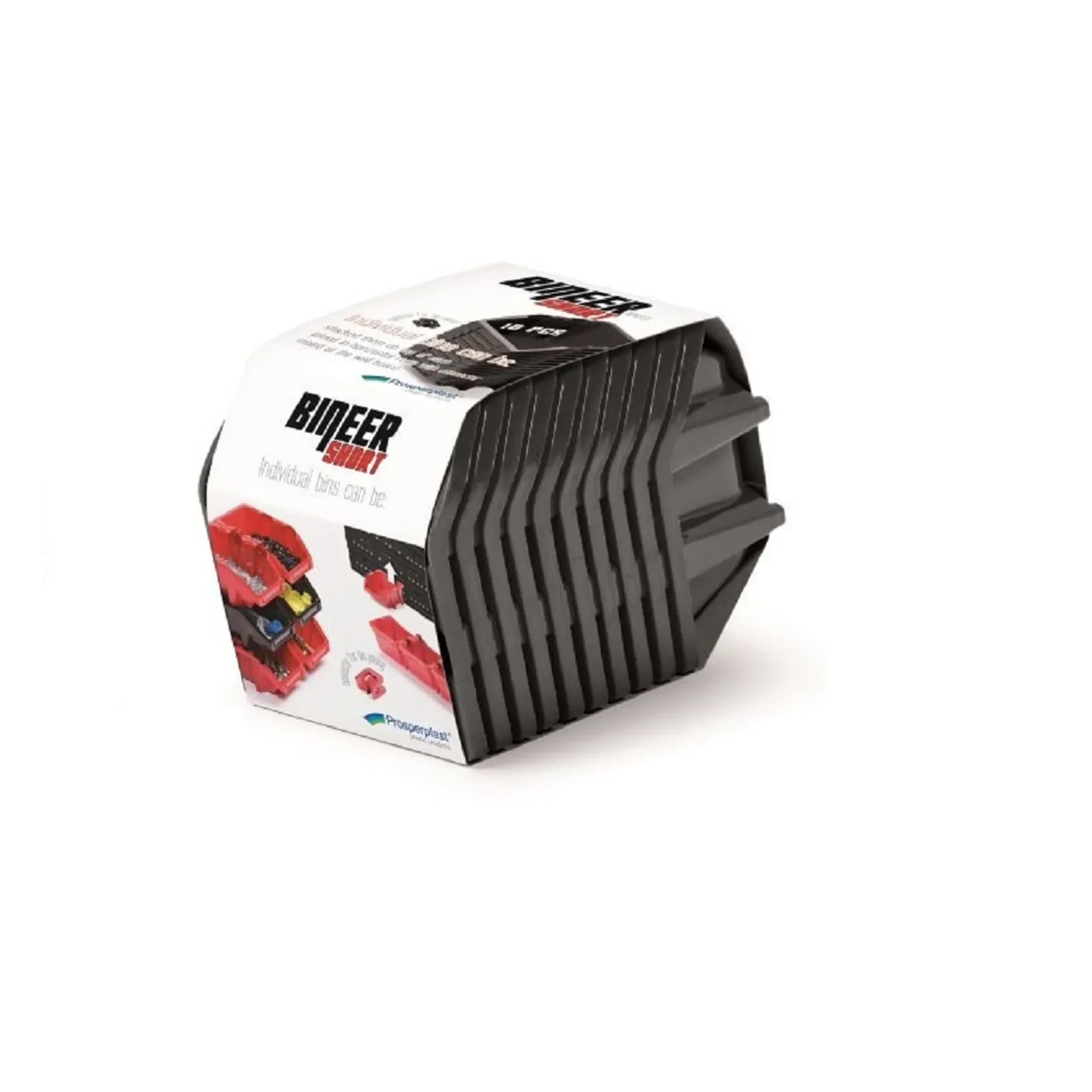 Die Boxen bestehen aus hochwertigem Kunststoff, können gestapelt, auf Werkzeugtafeln der Serie BINEER eingehängt oder mithilfe der beiliegenden Clips miteinander verbunden werden. Für zusätzliche Übersicht bietet jede Box Platz für Etiketten.